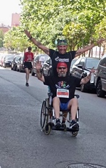 El Sergi és un voluntari que còrrer amb les persones amb mobiitat reduida de l'Associació Esplugues Sense Barreres per tal que puguin gaudir de les curses com una persona més. La foto és de la cursa solidària d'Esplugues.